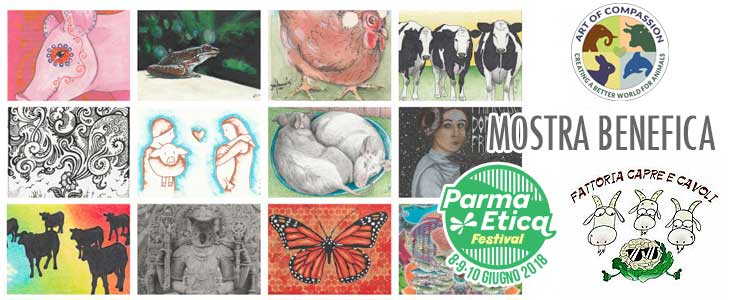 Mostra d'arte internazionale a scopo benefico, ingresso libero. Presso palazina Eridania Via Barilla n 29 Parma, aperta dalle 9 alle 24 tutti i giorni. Parma Etica Festiva ospiterà in collaborazione con The Art of Compassion Project una mostra d'arte contemporanea di artisti Internazionali. Le opere saranno messe in vendita durante i tre giorni di Festival e l'intero ricavato sarà devoluto in beneficienza al rifugio, oasi di pace per tutti gli animali Capre e Cavoli.